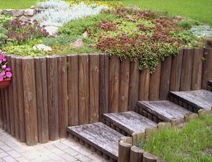 Самая легкая в устройстве является подпорная стенка из дерева. Для нее отбирают бревна, диаметр и высота которых связаны с перепадом грунта на террасах следующим образом: если высота стены не превышает 1 м, то длина выбранных бревен не должна быть меньше 1,5 м (где 1 м будет возвышаться над землей, а 0,5 – находиться в земле). Деревянные части, которые будут погружены в землю, необходимо тщательно пропитать специальными водоотталкивающими составами, которые предотвратят их загнивание. Можно также применить покрытие из горячего битума или обжечь нижнюю часть бревна на костре – это также защитит древесину. Для установки деревянной стенки роют траншею по намеченной линии. Глубина ее рассчитывается на 5-10 см больше, чем длина вкапываемой нижней части бревна, а ширина – больше бревенчатого диаметра на 20 см.