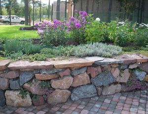 Работы по возведению подпорной стенки начинаются с рытья траншеи, ширина которой на 5-10 см больше, чем ширина будущего фундамента. На дно полученной канавы ссыпают гравийно-песчаную подушку толщиной 20-30 см, тщательно ее утрамбовывают. Заливают траншею бетоном, следя, чтобы высота готового фундамента была ниже уровня земли на 15 см. После того, как фундамент застынет, начинают выкладывать камни. В том случае, если для скрепления камней, применяют цементный раствор, то образующиеся пустоты заполняют затирочной смесью, если же кладка производится сухим способом, то в швах располагают садовый грунт и высаживают там растения.