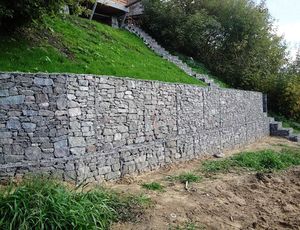 В настоящее время огромную популярность получили подпорные стенки из габионов – контейнеров их металлической сетки, заполненных каменным материалом. Монтаж подобной стенки производится очень легко. Если стенка небольшая, то фундамент под нее не нужен, если же высота перепада грунта превышает 1 м, то требуется ленточный фундамент, который возводится так же, как при кирпичной или каменной кладке. После того, как основание готово, на него устанавливаются контейнеры, связываются между собой оцинкованной проволокой. После этого вдоль лицевой стороны подпорной стенки укладываются наиболее декоративные камни (гранит, плитняк), а остальной объем, который будет не виден, засыпают щебнем, булыжником, галькой.