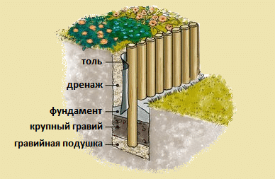 На дно траншеи выкладывают гравийную подушку толщиной 5-10см, которую тщательно утрамбовывают. Бревна выставляют на гравий строго вертикально, обвязывая их для плотности сверху проволокой или же прибивая друг к другу гвоздями. Это обеспечивает максимальную устойчивость стены, даже с учетом возможного смещения грунта. С задней части бревен, там, где они соприкасаются с землей, укладывают лист рубероида или толя. Далее заливают траншею бетоном. В том случае, если подпорная стенка совсем небольшая и выполняет скорее декоративную функцию, то можно просто засыпать траншею камнями и тщательно их утрамбовать.