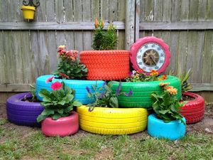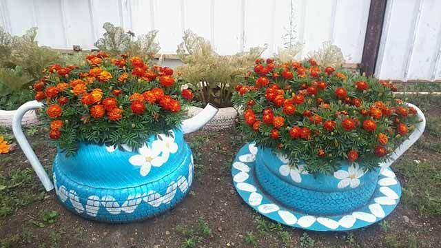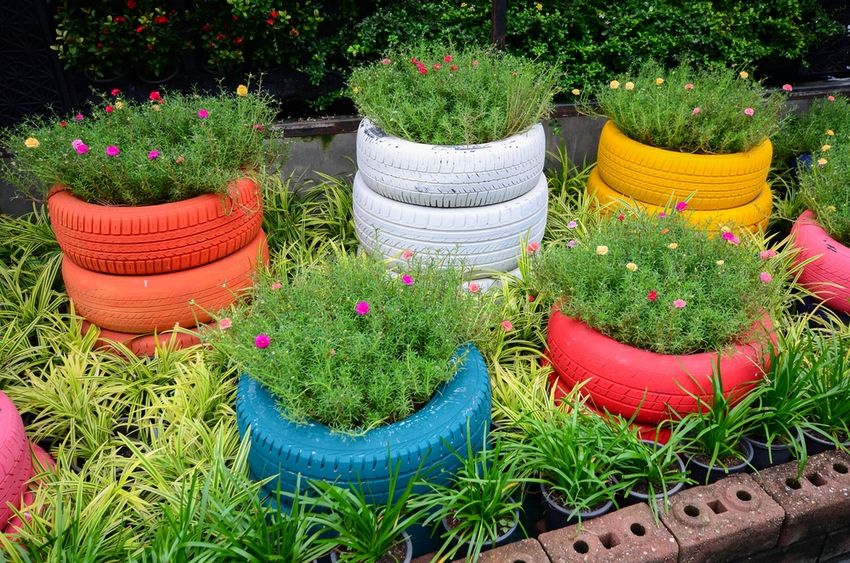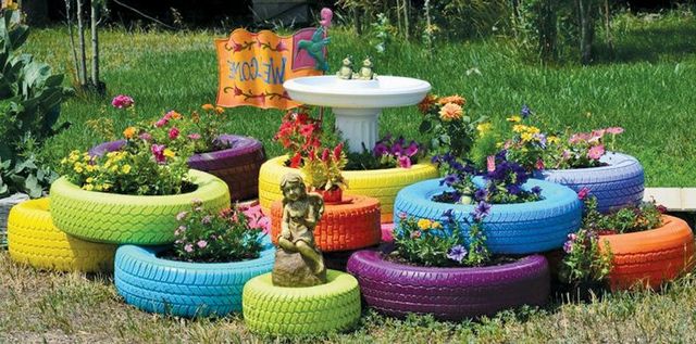 Цветники, которые делают с использованием старых покрышек, можно разделить на два вида: одиночные клумбы или групповая композиция, которую устанавливают в одной плоскости или несколькими ярусами. Делают низенькие или высокие (из нескольких шин, поставленных друг на друга) цветники, варьируют разные по диаметру или высоте шины. Покрышки устанавливают на земле или на специальных подставках. Старое колесо, при помощи вашей фантазии, ножа и сильных рук можно превратить в роскошное произведение искусства для украшения или сада.