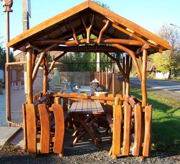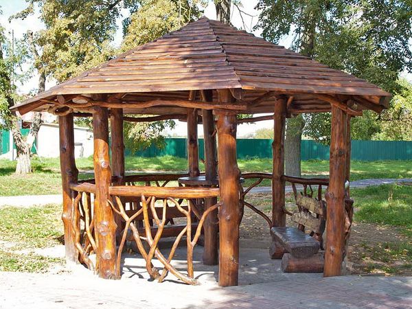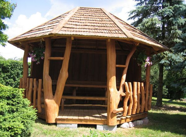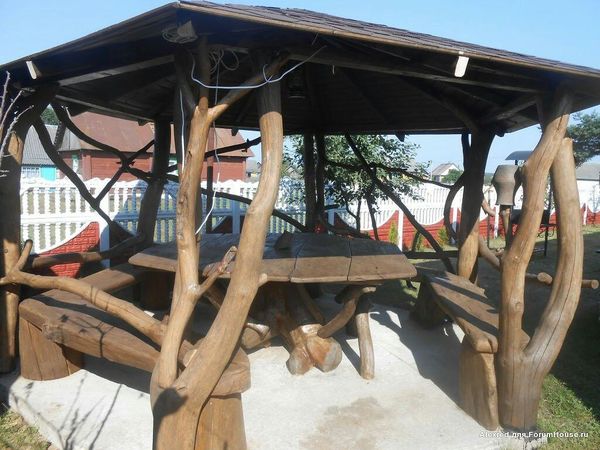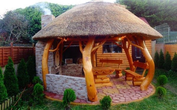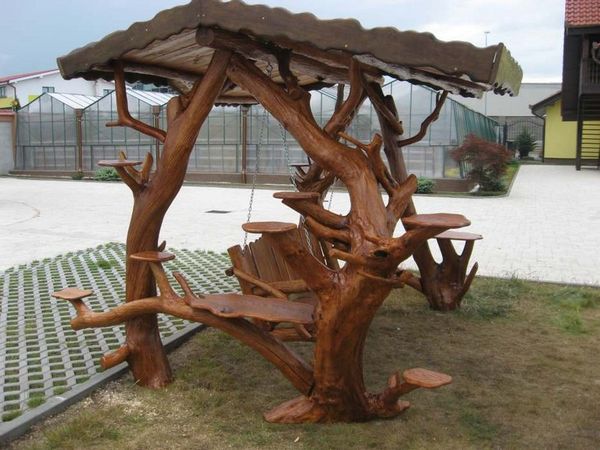 Любители оригинальных и неповторимых вещей могут сделать своими руками креативную беседку из коряг и стволов деревьев. Все, что необходимо для создания такой прелести, – это найти заготовки и иметь немного художественного вкуса. На такую постройку уйдет совсем немного времени и средств.