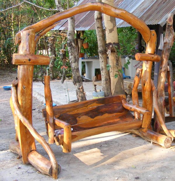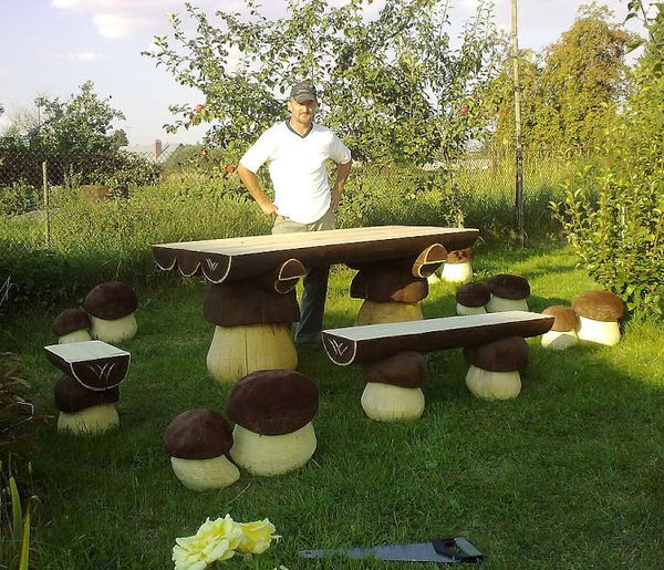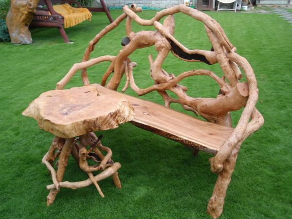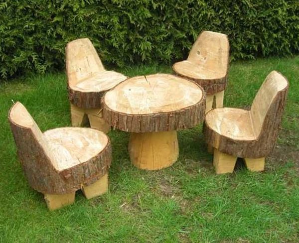 В последнее время большое распространение получили поделки из дерева, выполняющие роль мебели. Цена таких изделий, выполненных профессиональными мастерами, достаточно высока. Но простой стол, скамью или даже набор мебели вполне можно сделать самостоятельно. Дерево можно использовать в комбинации с другими материалами: резина (старые покрышки), металл, камень, бетон, пластик, стекло.