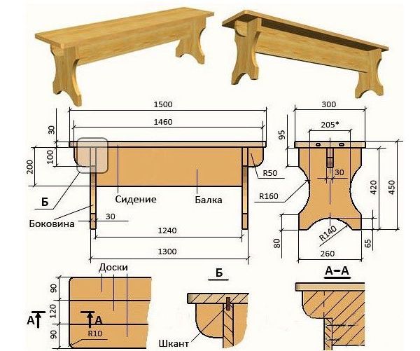 Существует простейшие конструкции изготовления скамеек из досок. Самый простой вариант — деревянная лавка без спинки. На чертеже ниже представлена лавка, полностью сделанная из доски толщиной 30 мм с опорной балкой.