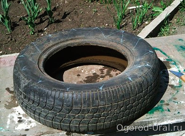 Кладём покрышку на бок, берём маркер и чертим на боковине шов для выреза в виде лепестков. Края лепестков чертим от края протектора до внутреннего уплотнительного кольца. епестки можно сделать остроконечными, а можно и закруглить.