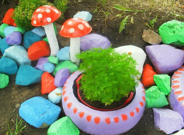 Теперь нужно украсить наше творение. Красить резину лучше акриловой краской, она долгое время держит цвет и не тускнеет. Можно покрасить покрышку эмалью или масляной краской, но через год краска начнёт тускнеть и растрескиваться. Перед покраской покрышку нужно протереть от пыли тряпкой и обезжирить уайт-спиритом, растворителем или ацетоном. Красить покрышку лучше краскопультом, но можно и обычной кисточкой. Очень хорошо смотрятся клумбы, разукрашенные сразу в несколько цветов. Когда краска высохнет, клумбу устанавливаем на место, засыпаем дренаж, грунт и высаживаем цветы.