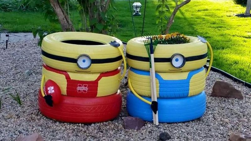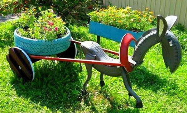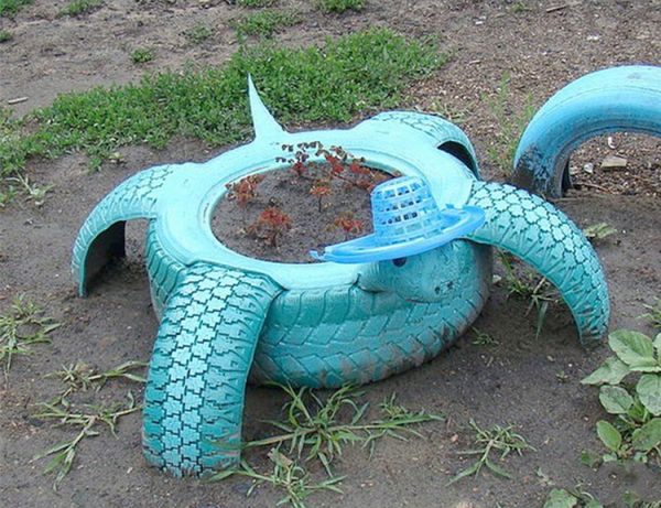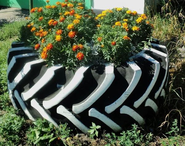Целые покрышки устанавливают отдельно, группами, в одной плоскости или несколькими ярусами (см. цветник из покрышек). Делают низенькие (одиночные) или высокие (из нескольких шин, поставленных друг на друга) клумбы, варьируют разные по диаметру или высоте. Клумбы из шин устанавливают на земле или на специальных подставках, вешают на стены и на деревья. Как при помощи ножа, красок и сильных рук превратить старое колесо в роскошную клумбу для цветов. Из старых покрышек делают причудливые фигуры из шин для украшения двора или сада.