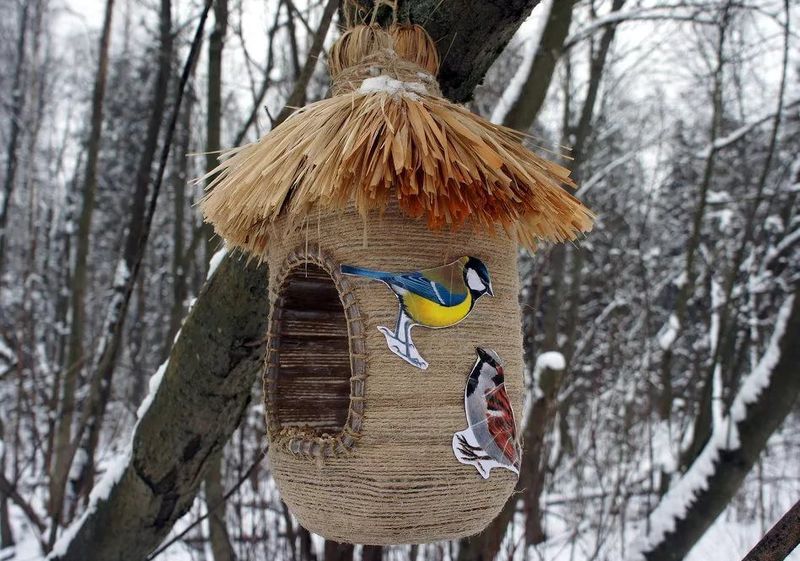 При оформлении кормушек для птиц все ограничивается только вашей фантазией. Главное, чтобы декор не пугал пернатых. Птицы настороженно относятся к чрезмерно ярким, шуршащим, гремящим предметам.