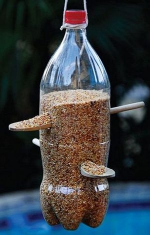 Кормушка для птиц из 1,5 литровой пластиковой бутылки и ложек |