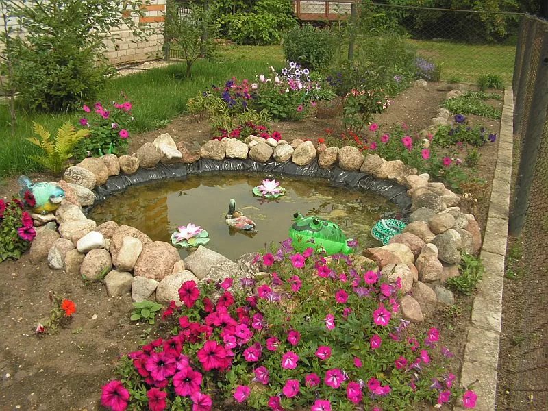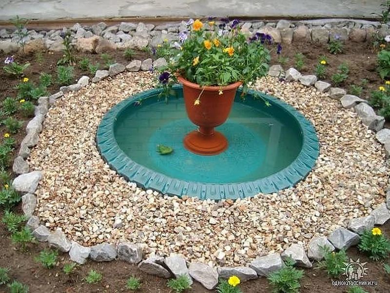 Резиновую основу можно углубить по-разному, все зависит от вашей дизайнерской идеи. Самый простой способ - выкопайте с помощью лопаты подходящую яму, засыпьте ее песком, сверху выложите шину. Возьмите укрывной материал для бассейнов (или пленку ПВХ) и расстелите его по дну и бортикам "пруда", выводя за края шины. Залейте прудик водой, тогда легче будет расправить пленку. Для того чтобы пленка не съезжала, выложите вокруг шины камни. Задекорируйте место вокруг прудика щебнем, камнями, растениями и симпатичными элементами, чтобы покрышки не было видно.