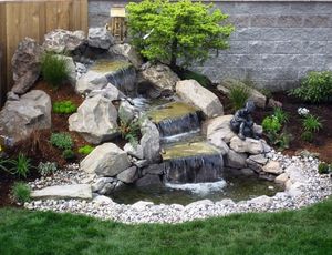 Эффект падения водных потоков создается благодаря сооружению на пути их вытекания преград – небольших уступов, высотой 15-30 см. Нижний уступ должен устанавливаться выше поверхности воды в пруду на 30 см. Общая высота каскада обычно не превышает 1,5 м.