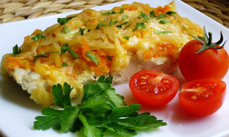 Полноценное блюдо из филе минтая можно приготовить, если запечь его с овощами под сырной шубкой. Ингредиенты: