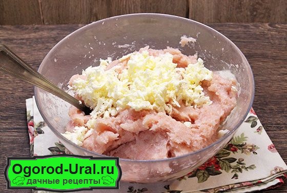 ❸ Сливочное масло для этого рецепта должно быть твердым, поэтому его заблаговременно убирают в морозильную камеру. Холодный брусок натирают на крупной терке, периодически вмешивая в фарш для равномерного распределения масляной стружки. Готовый фарш накрывают и на полчаса убирают в холодильник (котлеты, сформированные из охлажденной массы, лучше держат форму в процессе жарки).