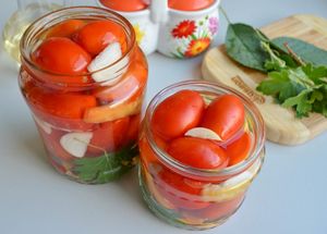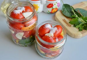 Прежде всего необходимо обязательно простерилизовать банки и крышки, предназначенные для консервирования. Можно тщательно промыть их и обдать кипятком, но лучше прокипятить, выдержать над паром или "прожарить" в духовке. Томаты для консервации отберите небольшие, спелые, крепкие и здоровые - только такие будут отлично храниться в маринаде всю зиму. Количество ингредиентов в рецепте рассчитано на 3 литровые банки.