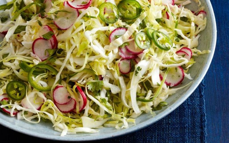 Приготовление:❶ Шинкуем капусту тонкой соломкой. Добавляем по щепотке соли и сахара. Отжимаем капусту руками, чтобы она пустила сок. Свежую молодую капусту сильно мять не обязательно, а вот с полежавшим овощем придется повозиться. Кстати, белокочанную капусту в этом салате вполне можно заменить и пекинской, только вот отжимать ее не нужно. ❷ Огурцы нарезаем соломкой. Можно натереть их и на крупной терке, только придется обязательно слить выделившейся сок. ❸ Редис натираем на крупной терке. ❹ Мелко нарезаем лук и зелень. ❺ Все ингредиенты соединяем и солим по вкусу. Вливаем растительное масло и хорошо перемешиваем.