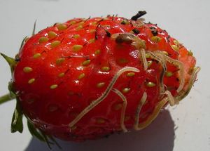 Одним из самых распространенных вредителей земляники является нематода. Чаще всего она поражает молоденькие кустики клубники, откладывая на ее листочках и в почках яйца. Вылупившиеся личинки недели через две превращаются во взрослые особи – мелких белых червячков длиной до одного миллиметра.