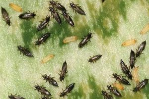 Мелкие насекомые желто-коричневого цвета питаются клеточным соком листьев клубники, в результате чего кусты вянут и погибают. Яйца откладываются на нижних пластинках листьев, за лето выводится пять поколений. Зимой трипс прячется в почве под кустами клубники. Выявить трипса можно по деформации и опадению листьев. От нашествия насекомых страдают цветоносы клубники.
