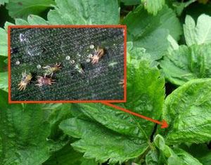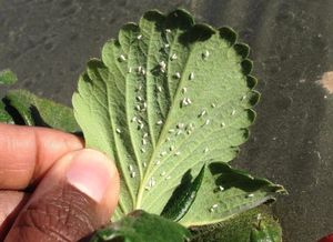 Маленькая белая бабочка с двумя парами миниатюрных крылышек питается соком клубничных листьев, а яйца откладывает на их нижней стороне. Личинки присасываются к листьям, образуя подобие кокона. Из них затем выходят взрослые особи. За один сезон белокрылка дает до четырех поколений, а зимует в почве, под кустами клубники. Эффективным средством борьбы с ней является использование мульчирующей пленки на грядках. |