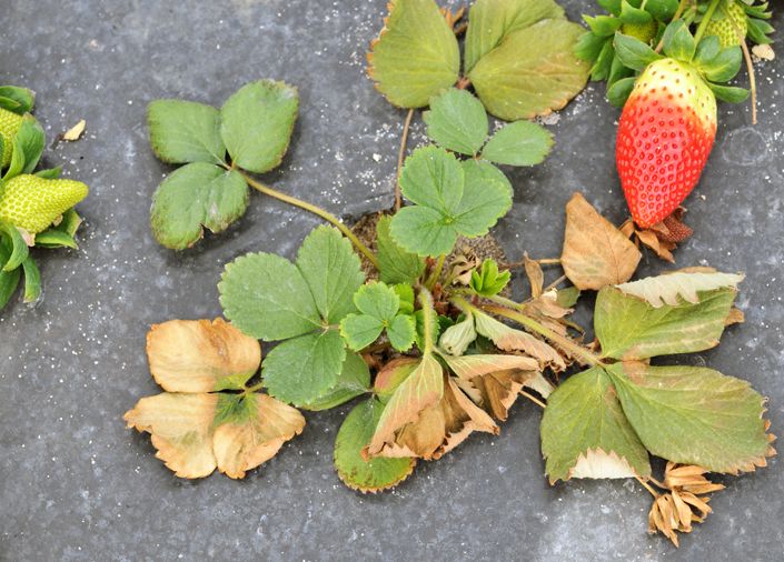 У клубники наблюдаются признаки фузариозного и фитофторозного увядания. Болезнь грибковая, проявляется бурым цветом листиков и черешков, края листовых пластинок выгибаются наверх. Плодоношение снижается, а с отмиранием мочковатых корней растение погибает.
