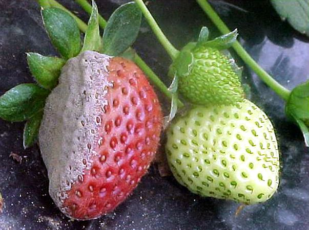 Заболевание легко обнаруживается по пушистому налету на коричневатых пятнах, которые появляются на ягодах клубники. Грибковая инфекция обычно возникает в период частых дождей и очень быстро переходит на соседние ягоды, а затем поражает и весь куст. Плоды с пятнами следует собрать и уничтожить. Однако при поражении листьев и черешков уничтожению подлежит весь клубничный куст.