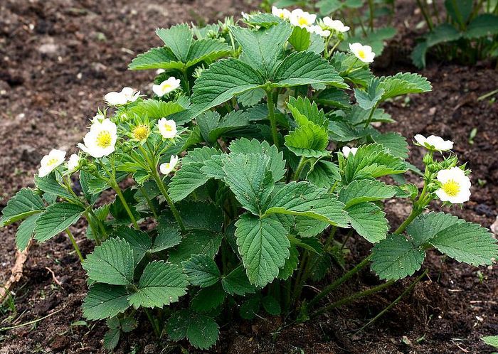 Перед тем, как посадить клубнику, желательно провести профилактику грибковых заболеваний, обеззаразив почву за пару недель до высаживания рассады нагретым до 70°С раствором извести и медного купороса (500 г/50 г/10 л воды). Для опрыскивания одного квадратного метра грунта садоводы используют 1 литр состава. Грядки под посадку обычно удобряют компостом, а для более капризных, гибридных сортов - верхние 10 см грунта должны состоять из смеси дерновой земли, торфа, белого песка и перегноя, взятых в равных пропорциях.