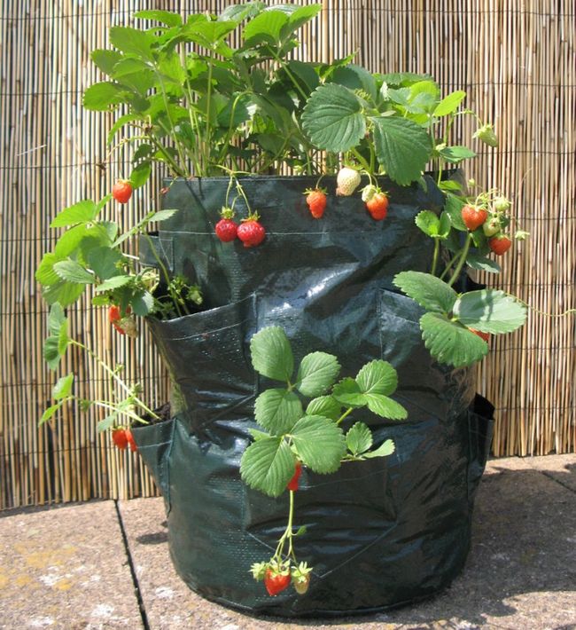 Этот способ выращивания клубники в теплице во многом аналогичен предыдущему. Те же требования предъявляются к субстракту, к посадочным мешкам и даже к уходу за растениями. Но технология вертикального выращивания имеет свои преимущества и особенности. Кстати, сейчас в продаже появились специальные мешки для вертикального выращивания клубники (на фото ниже).