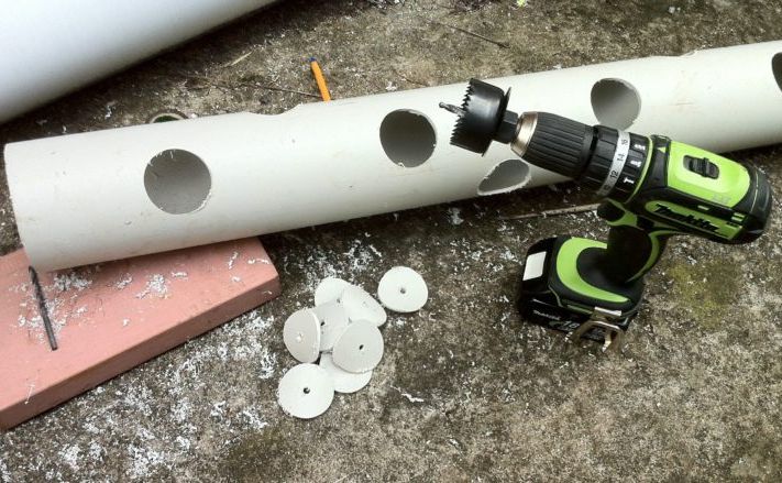 В трубе сечением 100 мм с помощью шуруповерта и коронки вырезают отверстия так, чтобы они располагались на одной линии и находились на расстоянии 20-25 см друг от друга.