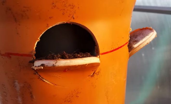 Закрывают нижний торец узкой трубы заглушкой соответствующего размера. Трубу сечением 100 мм вставляют в трубу сечением 200 мм. Закрепляют более узкую трубу с помощью проволоки и деревянных брусочков так, чтобы она располагалась ровно по центру. Заполняют свободное пространство между трубами грунтом (состав субстракта: торф и перлит в равных пропорциях (также подойдёт смесь из дерновой земли, речного песка, опилок и перегноя в пропорции 2:1:1:1)