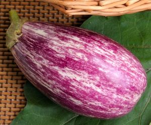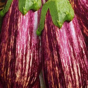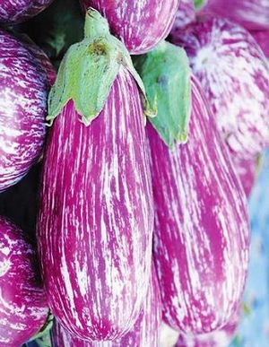 Раннеспелая разновидность с интересной окраской плодов. Сорт высокоурожайный, баклажаны достигают спелости через 105–117 дней после появления всходов. Высота полураскидистых растений 110–120 см. Плоды обратнояйцевидные, с редкими шипами на чашечке, сильноглянцевые, в светло-фиолетовую и белую полоску. Весят от 500 до 900 г., не горчат. При выращивании в теплицах урожайность может достигать 9.5 кг. на м.кв. |