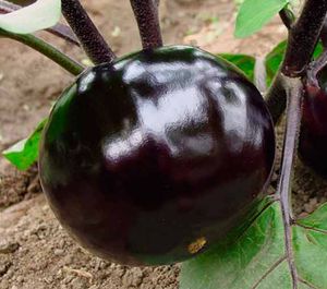 На низкорослом кусте плоды вызревают за 105–120 дней. Растение полураскидистое, нуждается в подвязывании к опоре. Фиолетовый цвет баклажан имеет зеленый отлив, форма плодов — укороченная грушевидная. Поверхность матовая, без блеска. Вес плодов может достигать 130 гр., средне-плотная мякоть без горечи, вкусная. Урожайность достигает 1,5 кг. с растения. Сорт устойчив к засухе и гнилям. |