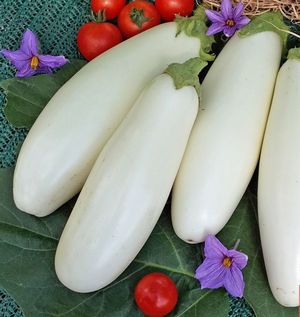 Баклажан-альбинос с вкусными плодами, окрашенными в белый цвет. Сорт отличается скороспелостью (от 93 до 110 дней) и высокой урожайностью. Кусты высокие, более метра, полураскидистые. Цилиндрические по форме плоды достигают 23 см. длины, весят до 400 г. На вкус 'Cнежок' очень нежный, мякоть почти без семечек и не горчит. Урожайность сорта до 8.5 кг. на м.кв. |