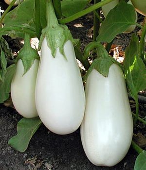 И на последок представлям вам сортового блондина. Плотная белая мякоть без горечи имеет низкое содержание соланина. Длина плодов — 20 см., диаметр каждого — 5-6 см. Очень удобная для готовки форма баклажанов. Куст вырастает высоким, его необходимо подвязывать. |