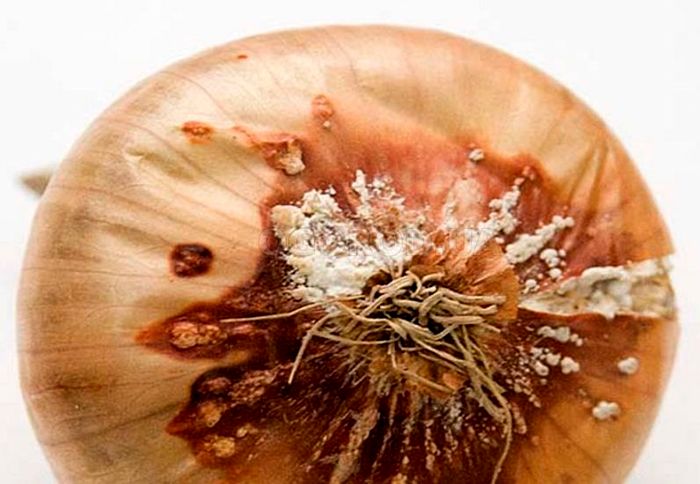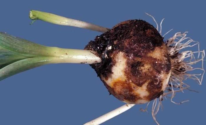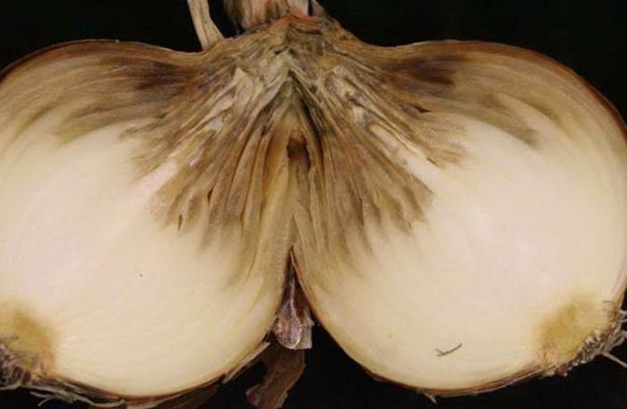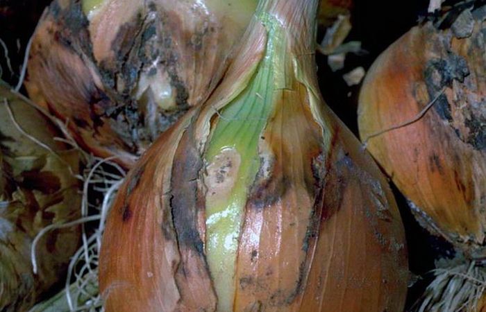 Как и серая гниль, заболевание проявляет себя во время хранения. Луковицы становятся размягченными, при их разрезе видны гнилые ткани бурого цвета между здоровыми чешуйками со следами развития грибка, появляются стойкий неприятный запах мелкие мушки. Грибок проникает в недостаточно просушенные и поврежденные луковицы