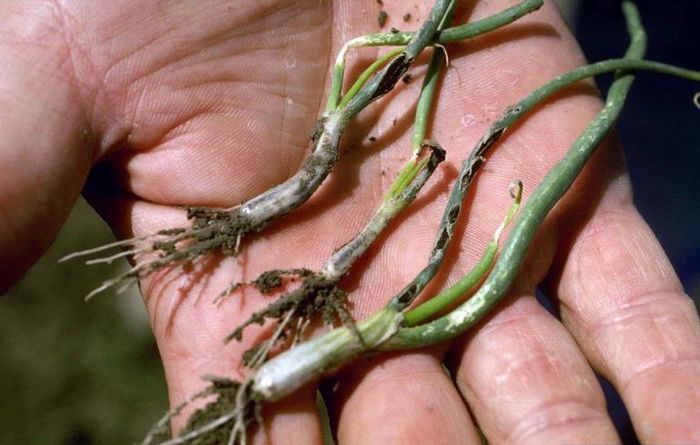 Это заболевание поражает лишь лук-сеянец. На его листьях возникают продольные черные полосы – первые признаки головни. Потом на пораженном месте появляется разрыв и выступает черная масса в виде порошка – споры паразита. Листья, пораженные болезнью, изменяют форму и засыхают. На поверхности и разрезе луковицы возникают черные полоски – споры головни, просвечивающие через кожицу. Во время зимнего хранения такие луковки быстро гниют.