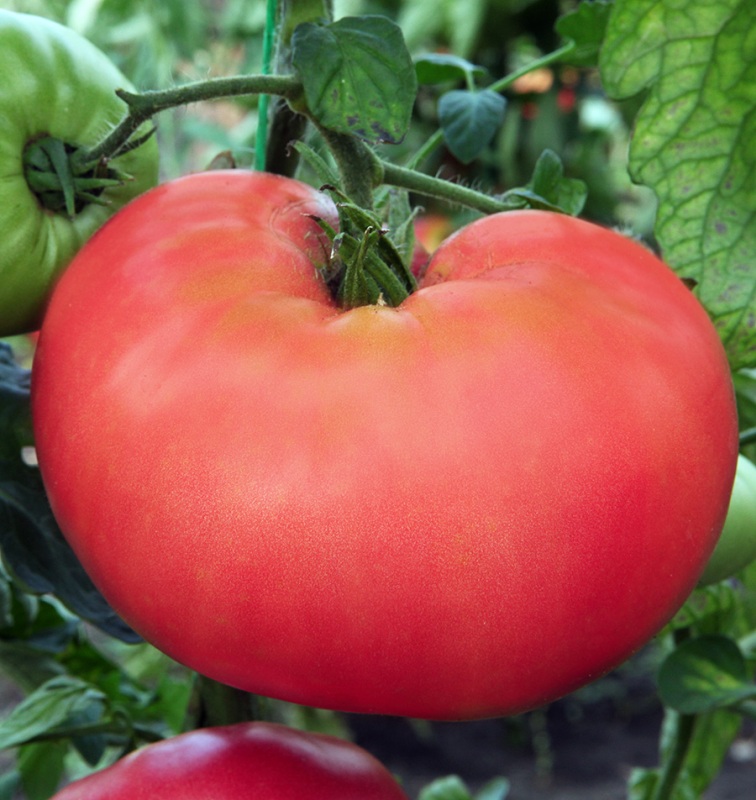 Куст сильный, открытый, листья мощные, тёмно-зелёные. Куст обязательно нужно подвязывать к опоре, иначе он просто рухнет под тяжестью огромного урожая. Плоды очень вкусные, насыщенного малинового цвета, массой 500-600 г. Куст высотой 70-100 см. |