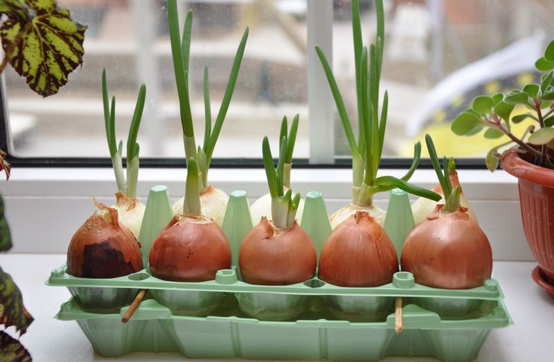 Очень удобно использовать для выращивания перьев лука яичные кассеты (см. фото выше). Нижнюю и верхнюю части яичного контейнера разделяют. У ячеек нижней части срезают донышко и в каждую втискивают по луковичке (с удаленной верхушкой). Верхнюю часть контейнера ставят в нижнюю (она служит поддоном) и наливают водичку. Чтобы обеспечить пространство для корешков, между частями яичного контейнера просовывают пару карандашей или палочек. Остается только периодически подливать воду и ждать появления зелени.
