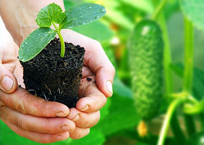 Как сажать рассаду огурцов и нужно ли перед этим удобрять грунт на участке? Поскольку корневая система у огурцов неразветвленная, удобрения вносят непосредственно во время посадки: в грядках делают лунки глубиной 40 см на расстоянии 60 см друг от друга, засыпают в них слой почвы, смешанной с компостом или перегноем, затем добавляют слой плодородной почвы без удобрения, переваливают на него сеянцы с земляным комом или устанавливают в лунку торфяной горшочек с рассадой, засыпают лунку почвой и поливают из расчета 3 л воды на одно растение.