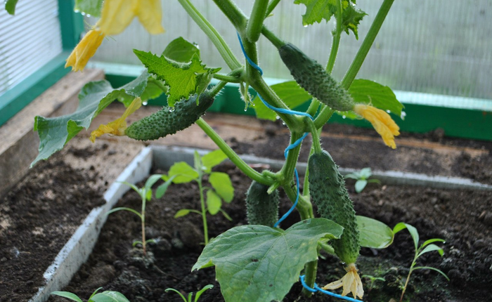 Поскольку огурцы представляют собой лиану, они нуждаются в подвязке – процедуре, которая экономит пространство, позволяет избежать заражения некоторыми болезнями и облегчает сбор урожая. Подвязывать огурцы к опоре начинают в фазе развития 3-4 листьев, фактически почти сразу после высадки в открытый грунт.