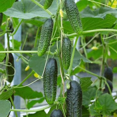 Могучая корневая система, активное отрастание боковых побегов в сочетании с холодостойкостью и комплексной устойчивостью к болезням обуславливают продолжительное, дружное плодоношение. После основной волны плодоношения на главном стебле урожай начинает массово поступать с коротких боковых побегов. Огурчики красивой ярко-зелёной окраски, очень высоких вкусовых качеств. Хороши для засолки, и для консервирования. Необходим опылитель — гибрид "Шмель". |