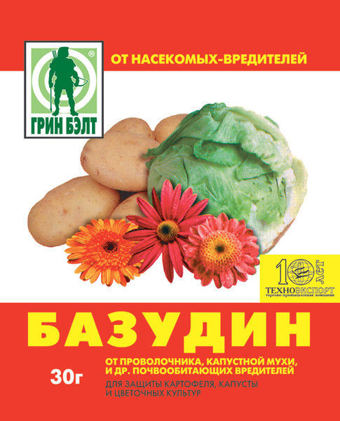 "Базудин" защищает растение от почвенных вредителей: медведок, проволочников, сороконожек, долгоносиков, личинок мух. "Базудин" используют также для защиты зерна в зернохранилищах и складах. "Базудин" гарантирует: длительную защиту, борется с вредителями по трем направлениям: контактное поражения, кишечные поражения, трансламинарное поражения. Удобный в использовании. Сохраняет свои свойства в течение длительного времени хранения. |