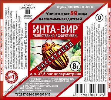 "Инта-Вир" – препарат широкого спектра действия. Активно применяется против жесткокрылых, равнокрылых, чешуекрылых и прочих вредителей. Основной составляющей "Инта-Вира" является циперметрин, который оказывает действие на нервную систему вредителей и приводит к параличу и смерти. Препарат особенно эффективен против таких вредителей, как тли, белокрылки, гусеницы (грызущие листья), трипсы. |