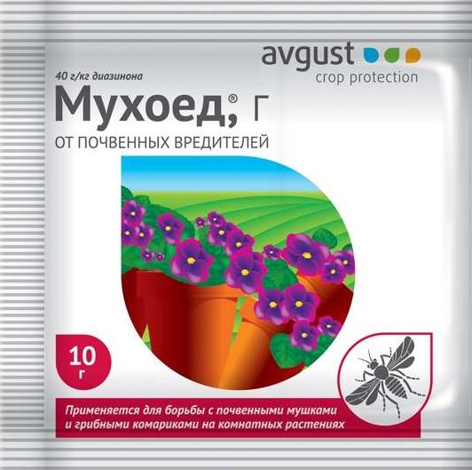 Инсектицид «Мухоед» предназначен для борьбы с грибными комариками, мухами и т.д. Применяется на луке, капусте и комнатных растениях. Препарат используется как против взрослых насекомых, так и против личинок. Погибают вредители в течение 2-3 суток после попадания препарата внутрь насекомого. Препарат не накапливается в грунте.