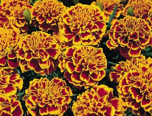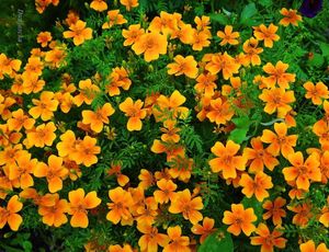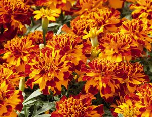 Редко вырастают выше 60 см. Они представляют собой компактные кустики с множеством махровых и немахровых соцветий, диаметр которых редко превышает 8 см. Эти бархатцы еще называют раскидистыми. Спросом у цветоводов пользуются сорта серии "Бонанза" высотой до 30 см (Бонанза Болеро, Бонанза Оранж, Бонанза Пламя и т.д.), обладающие высокой декоративностью махровых соцветий ярких цветов 5-6 см в диаметре и большой продолжительностью цветения; очень красивы бархатцы Кармен, украшающие цветник махровыми соцветиями с гофрированными лепестками красно-коричневого по краям и оранжево-желтого в середине оттенков.
