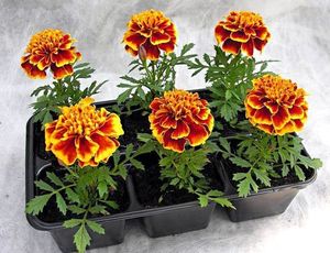 После появления первых двух настоящих листьев сеянцы бархатцев пересаживают в более просторные ёмкости. Лучше взять отдельные горшочки, но можно посадить рассаду в большие ящики, по схеме 7х7 см. При посадке ростки заглубляют до семядольных листьев, чтобы растения выросли крепкими и имели мощную корневую систему. Высокорослые сорта прямостоячих бархатцев, распикированные в общие ящики, желательно пересадить еще один раз, когда листья начнут перекрывать друг друга.