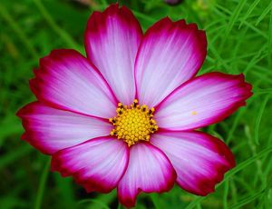 Некоторые сорта космеи не превышают высоты в 50см. Стебли у растения тонкие, гибкие, прямостоячие. Соцветия-корзинки, похожие на ромашки до 12 см в диаметре, растут одиночно или собраны в рыхлые щитковидные метелки. Срединные цветки в корзинках мелкие, трубчатые, желтоватые, а язычковые – крупные, пурпурового, розового, красного, белого, золотисто-желтого оттенка. Плод космеи – семянка темно-желтого, серого или коричневого цвета. Подробнее... |