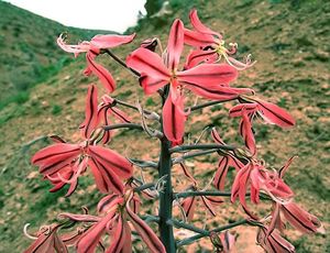 Встречается в горловине Ферганской долины, в окрестностях Кабула и в Турции. Это растение до 120 см высотой со светло-коричневыми корнями, голыми прямыми листьями, направленными вверх, голым темно–зеленым стеблем с сизым налетом, на котором расположена многоцветковая рыхлая кисть высотой до 60 и диаметром до 12 см. У цветков белые с коричневой жилкой прицветники, широко открытые околоцветники цвета сырого мяса с коричневой жилкой.