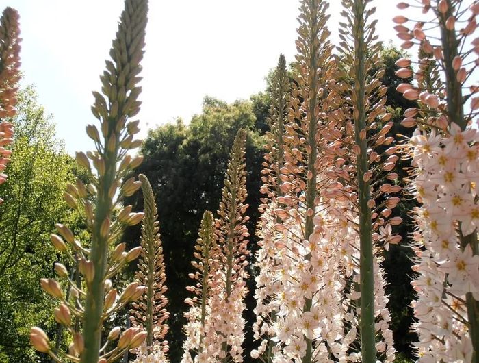 Эремурус Обелиск – выведенный в 1956 году сорт высотой до 150 см с белыми цветками и изумрудной серединкой, а также сорт Рофорд с цветками лососевого оттенка, сорт Романс с розово-лососевыми цветками и сорт Эмми Ро с желтыми.