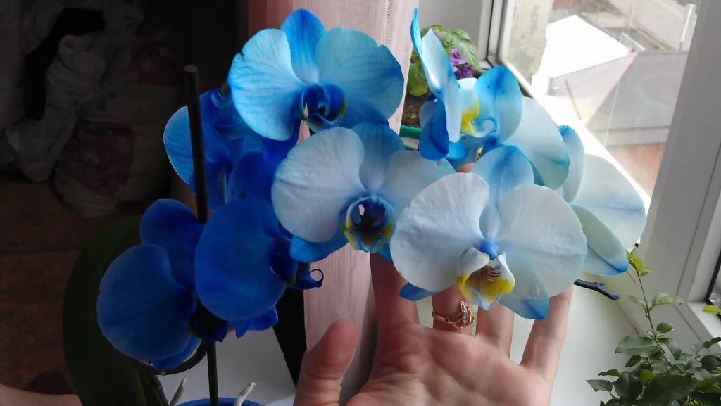 Купив или получив в подарок синее растение, внимательно осмотрите его. Если след от укола виден на цветоносе, то у растения шансов на выживание больше. Если же инъекцию делали в корень, то велика вероятность гибели. Иногда фаленопсис окрашивают с помощью полива окрашенной водой, в этом случае наблюдать синий оттенок можно не только на цветах, но и на листьях и корнях. Выживет растение или нет, зависит от степени причиненного ему вреда.