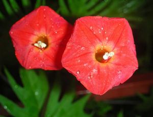 Ипомеи с ажурной резной листвой и небольшими цветками трубчатой формы. Популярные сорта: квамоклит перистый (Quamoclit pennata), квамоклит Слотера, или кардинальская лиана (Quamoclit x sloteri), квамоклит огненно-красный (Quamoclit coccinea), квамоклит лопастный (Quamoclit lobata) и сорт "Динь-динь" (на фото).