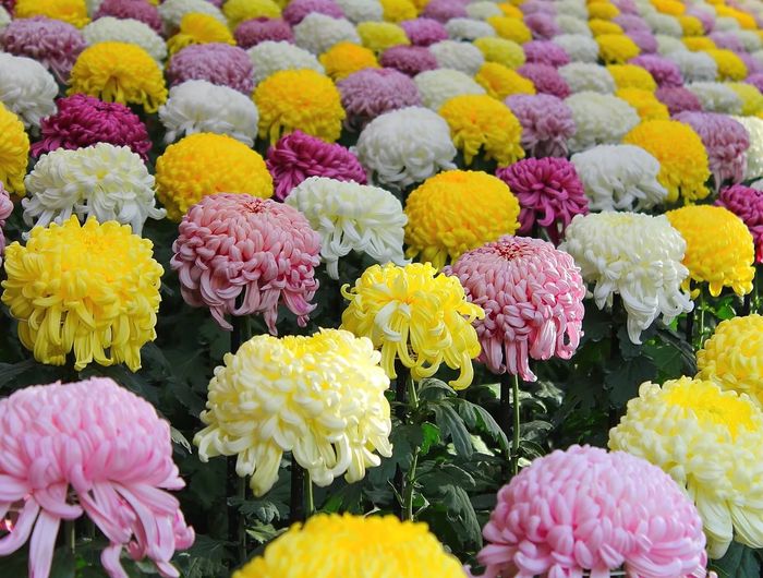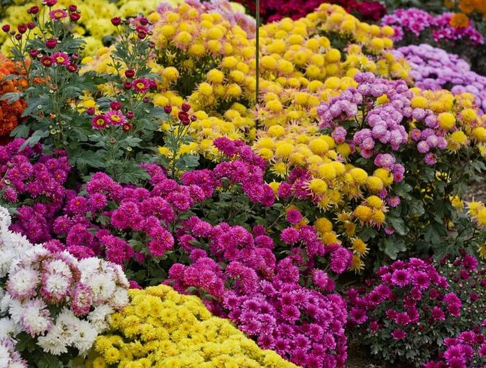 Как все растения короткого дня, хризантемы начинают цвести на в саду только тогда, когда день становится короче ночи. Для формирования бутона растению необходимо минимум девять с половиной часов темного времени в сутки. Многие цветоводы специально зачехляют бутоны, чтобы вывести особо крупные выставочные гибриды. Этот метод хорошо подходит для белых и желтых декоративных сортов. И наоборот, чтобы приостановить рост бутона, можно подсвечивать его по ночам. Грунтовые хризантемы, растущие на открытом воздухе, очень хороши для украшения вашего сада и не требуют большого труда и заботы. Но, все же, стоит знать некоторые секреты выращивания хризантем, которые помогут добиться их пышного цветения. Хризантемы делят на 2 основные группы: крупноцветковые и мелкоцветковые. Высотавой группы достигает 70-80 см, а у второй — 50-60 см. Для хорошего роста и обильного цветения хризантемы в период бутонизации подкармливают фосфорно-калийными удобрениями (их вносят сразу после полива или дождя). Также хороший результат дают внекорневые (по листьям) подкормки комплексными жидкими минеральными удобрениями (1-2%-ный раствор) и ростовыми веществами.